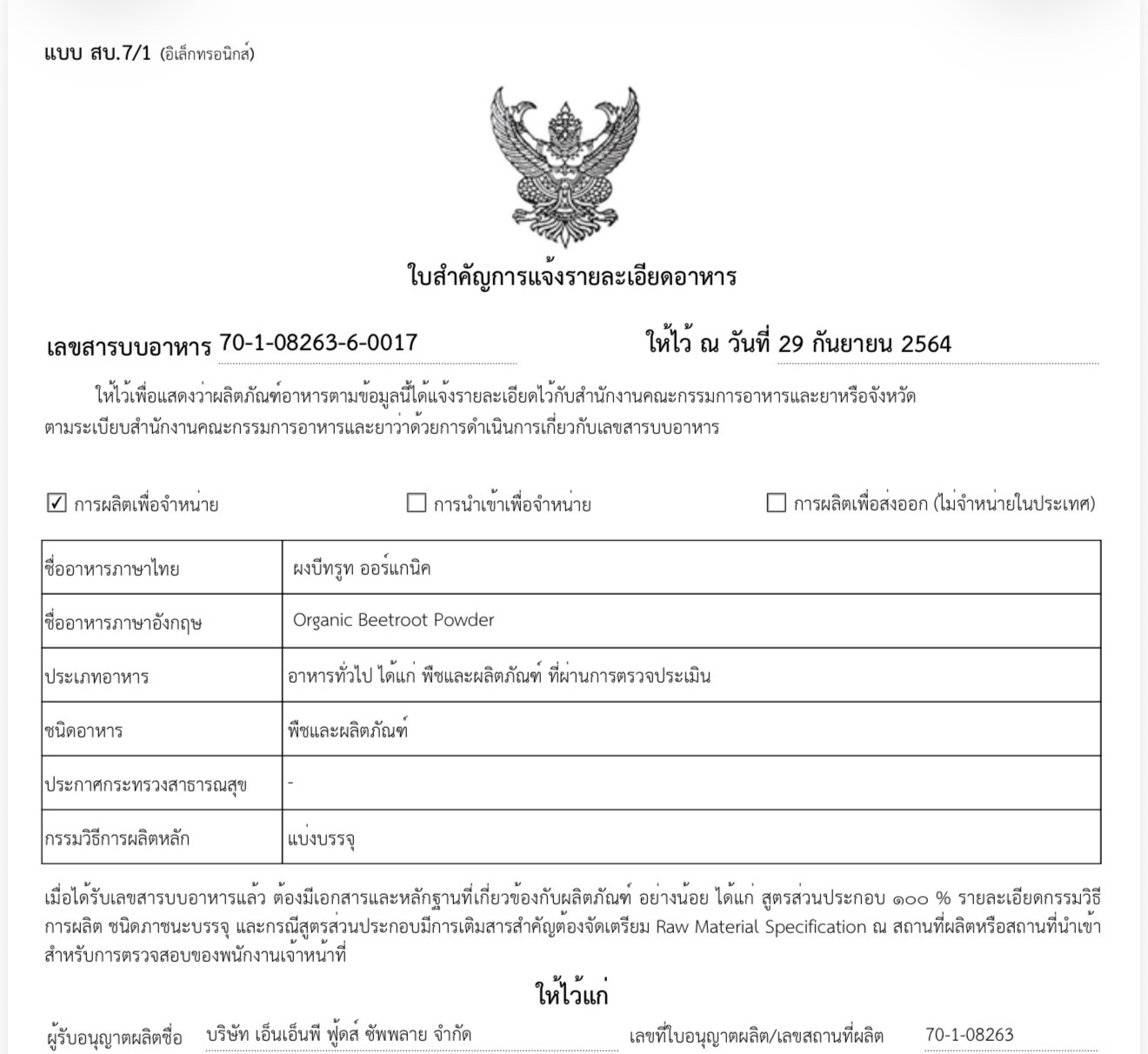 ผลิตด้วยกระบวนการสเปรย์ดรายอุณหภูมิต่ำ เพื่อให้ได้ผงเนื้อละเอียดและคงคุณค่าธรรมชาติของบีทรูท